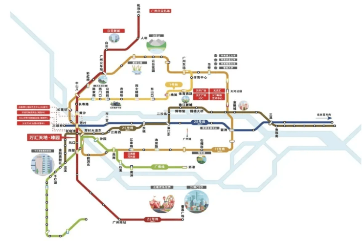 从交通维度看,项目距地铁1号线花地湾站约800米,步行约12分钟。1号线作为广州最早开通的地铁线路,贯穿越秀、天河、荔湾三大核心区,早高峰往体育西路方向班次密集,30分钟内可直达北京路、公园前、天河城等核心商圈。更值得期待的是,规划中的地铁25号线将在花地湾站与1号线交汇,形成双线换乘枢纽;而环线地铁11号线(“换乘之王”)在芳村站仅一站之遥,未来可快速通达琶洲、金融城、珠江新城等新兴就业中心。