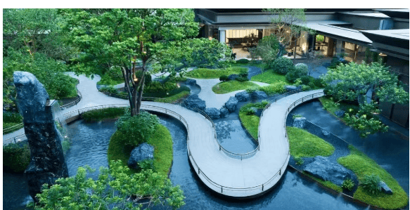 绿城深谙“惟有生活最珍贵”,在揽江印月打造了“一轴九院”园林格局,融合粤韵十二景,形成五重归家礼序。从地库光感坡道、地下光厅,到地面林荫步道、中央水景庭院,每一步都充满仪式感。