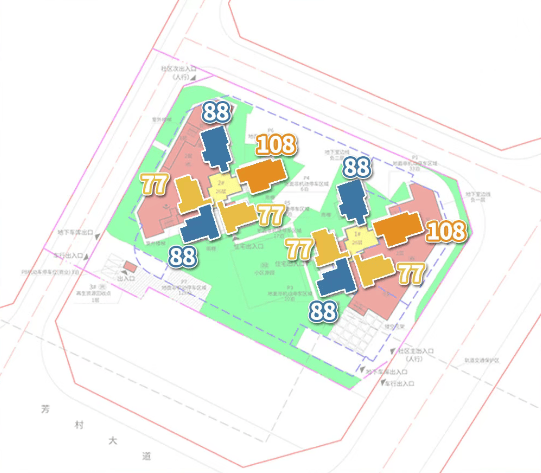 主力户型集中在77㎡到108㎡之间。其中77㎡三房两卫的格局很特别:主卧带独立卫生间,次卧与书房灵活可变,阳台贯通客厅与次卧,采光面拉满。实测使用率超过110%,这在新规限高背景下相当难得。88㎡做到四房,适合二胎家庭;108㎡则是南北通透大四房,公区开间超4米,实用性不输传统改善盘。