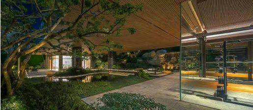 中央大园林占地约1.5万平方米,规划1300平方米榕樾山水会客厅。园林结合地形高差设计,形成多层次景观体验,包括下沉式广场、儿童活动区、绿道步行路径及屋顶花园。绿植与水景的结合增强生态属性,同时形成自然过渡空间,为居民提供舒适的日常休闲环境。
