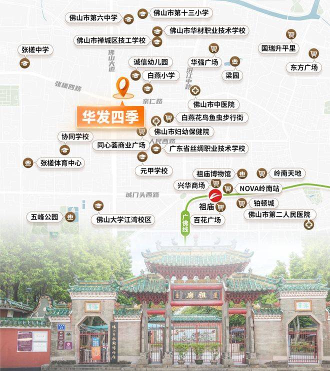 除了户型优势,华发四季在地段和配套上的实力同样突出。项目周边商业资源丰富,涵盖祖庙商圈、岭南天地以及铂顿城等大型商业体,购物、餐饮、休闲娱乐均能满足全家人的日常需求。教育配套方面,周边拥有白燕小学、佛山市第九小学以及佛山市第六中学等优质学府,家长可轻松安排孩子的就学问题,教育资源便利性高。医疗方面,佛山市中医院和佛山市妇幼保健院等三级甲等医院近在咫尺,为家庭成员的健康保驾护航。交通便利性方面,虽然项目距离地铁站稍有一定距离,但周边公交线路完善,自驾出行通达各区,轻松连接广佛两地,日常通勤及生活出行同样便捷顺畅。