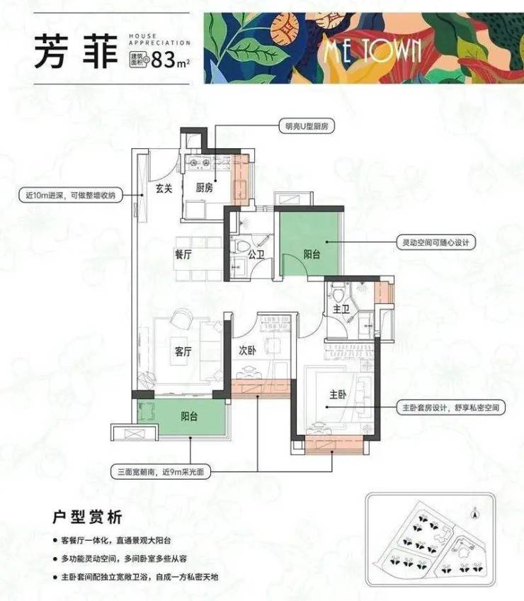 83平米三房两厅两卫:同样采用竖厅设计,但所有房间均朝南,主卧套房设计既实用又私密。