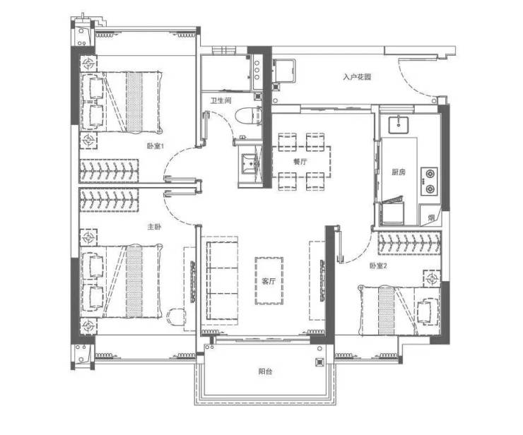 这是当前主推的明星户型。客餐厅一体化设计,南向阳台进深充足,阳光可直入室内深处;三个卧室均方正规整,主卧带飘窗,次卧靠近卫生间,动线合理,适合三代同堂或二胎家庭。得房率高达81%,在同面积段中极具竞争力。
