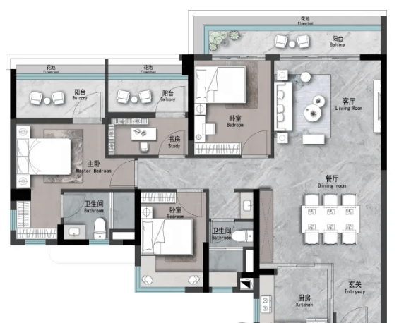其中,93㎡户型为 3 室 2 厅 2 卫,布局紧凑实用,适合三口之家;105-127㎡户型均设计为 4 室 2 厅 2 卫,南向全明格局,采光通风优良,满足多人口家庭的居住需求;140-182㎡大户型则为 4 室 2 厅 3 卫,奢阔空间设计,配备独立卫浴、大阳台等,适合追求高品质生活的改善型家庭。此外,项目样板间设于 A2 栋 2 楼,105㎡四房户型还配备品牌橱柜与中央空调,精装标准贴合现代生活需求。