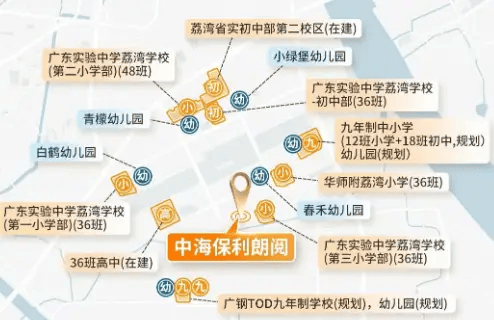 中海保利朗阅对口广东实验中学荔湾学校(花地湾校区),该校为省实本部直属分校,2023年9月已开学,设小学36班、初中24班,可提供2880个学位。