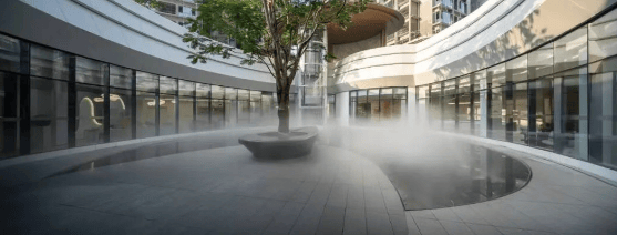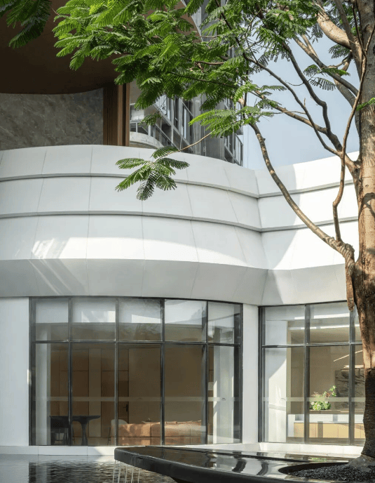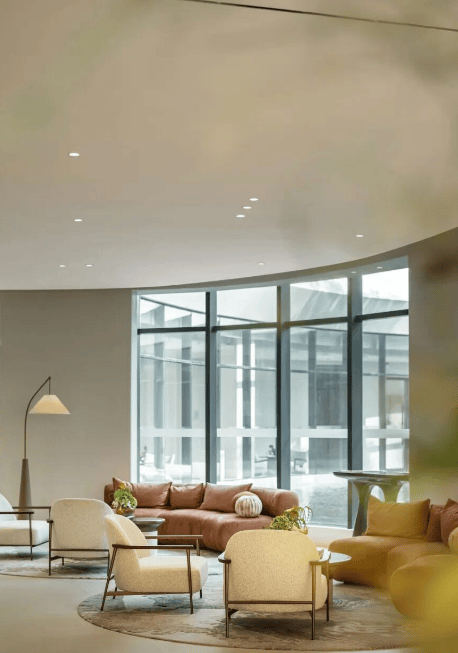 在设计理念上,睿住天元为顺控珑悦湾注入了「诗间自然」的核心理念,这是一场融合自然肌理、艺术质感与当代品味的沉浸式美学探索之旅。设计团队以自然为媒、以美学为骨,巧妙地将外部环境引入室内,创造出一种“无界共生”的空间体验。地下主入口设于地下一层,通过极具韵律感的流畅圆弧动线,无缝串联室内外空间,彻底打破了传统建筑固有的物理边界与视觉隔阂。通透的玻璃围廊贯穿整个环形公共区域,如同一条灵动的纽带,将室外的自然景致与室内空间深度融合,让天光毫无阻碍地自由洒落,树影随光线变化肆意摇曳,与底部汩汩流淌的叠级水景交织缠绕,相映成趣。这种设计语言不仅构建出沉浸式的自然景观,更以现代手法诠释了传统东方美学中“四水归堂”的经典意境,让归家与休憩的每一步都浸润在自然与人文交融的诗意氛围中。