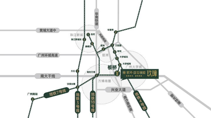 作为世界级万博板块的百万方城市低密大城,星河·盛世锦城坐落于万博·余荫山房北侧·板桥地铁站旁,地处南大干线经济带上的番禺黄金财智走廊,左手执掌万博、琶洲双商圈的繁华,右手坐拥广深港澳科技走廊、广州科技创新轴、南大干线经济带三大科创轴的发展红利,地理位置得天独厚,堪称番禺人居的“宝藏之选”。