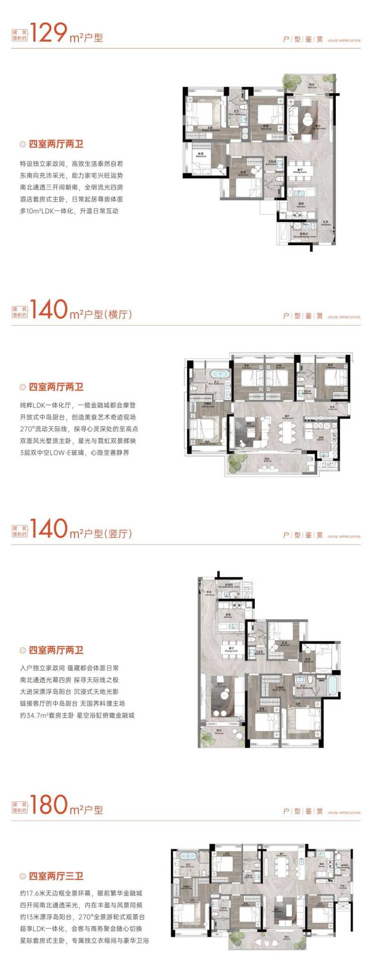 180平米四房:该户型空间宽敞,布局灵活,适合大家庭居住。主卧设有步入式衣帽间和独立卫浴,提升了居住的便利性和私密性。全屋采用国际一线品牌奢装,部分与香格里拉酒店同款,呈现更精、更奢、更极享的生活品质。