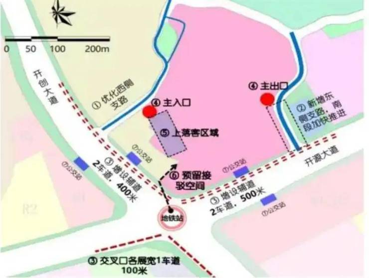 尽管项目不靠近现有的地铁站,但距离最近的地铁站大约2公里,可通过公交车接驳。值得一提的是,地铁6号线东延段的地铁口就在项目附近,一旦开通,出行将更加方便快捷。此外,项目周边还有多条主要道路如开创大道、开源大道等,形成了便捷的交通网络。