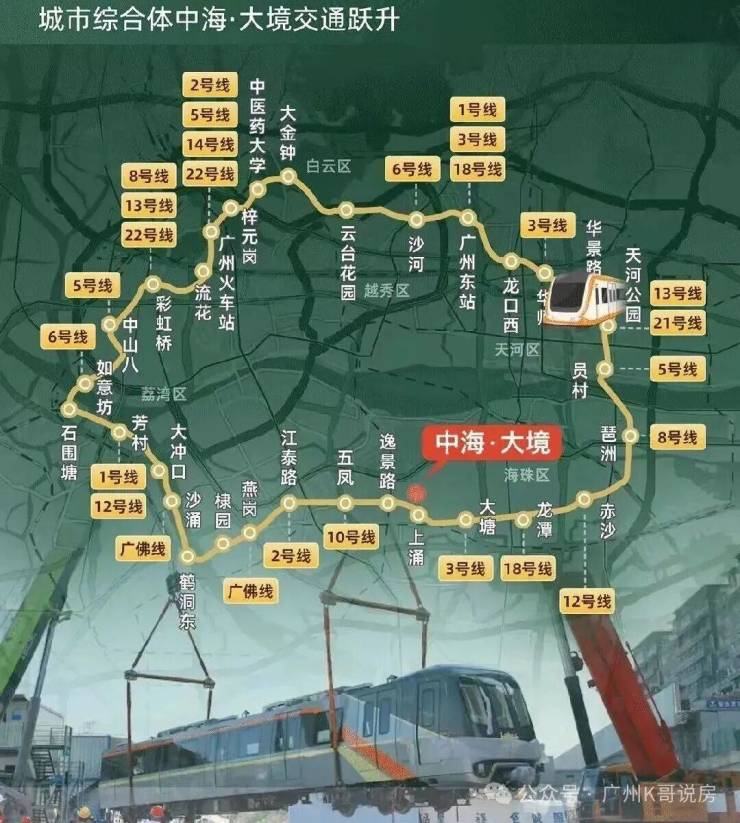 中海大境坐落于广州城市新中轴核心区位,坐拥主城顶级交通路网体系,地铁、主干道双重加持,实现全城无死角快速通达,完美适配高端自住、商务通勤、日常出行全场景需求。轨道交通方面,项目为地铁11号线上涌站优质上盖物业,地铁11号线作为广州首条市区环形地铁线路,被誉为广州地铁换乘之王,全线串联广州五大主城核心区域,可与广州所有已运营、规划中地铁线路实现无缝换乘,高效虹吸全城核心资源。