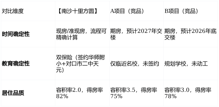 在南沙区,与【南沙十里方圆】形成直接竞争的项目主要有A项目、B项目等。我们从“时间确定性”“教育确定性”“居住品质”三个维度进行对比: