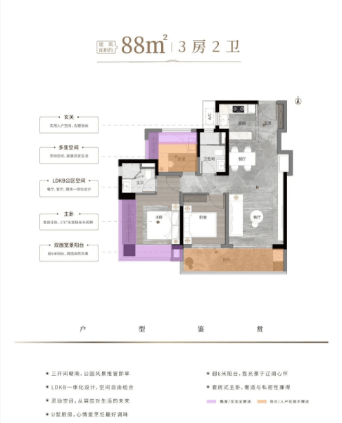 建面约88㎡三房两厅两卫:南向景观 全能生活空间