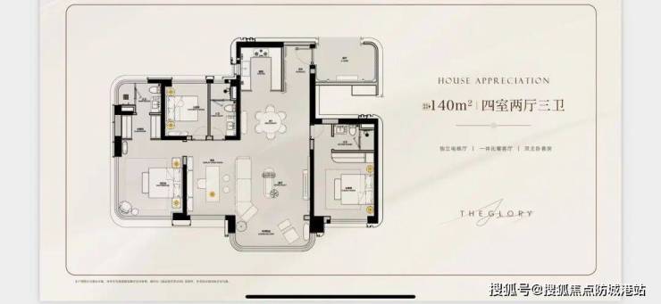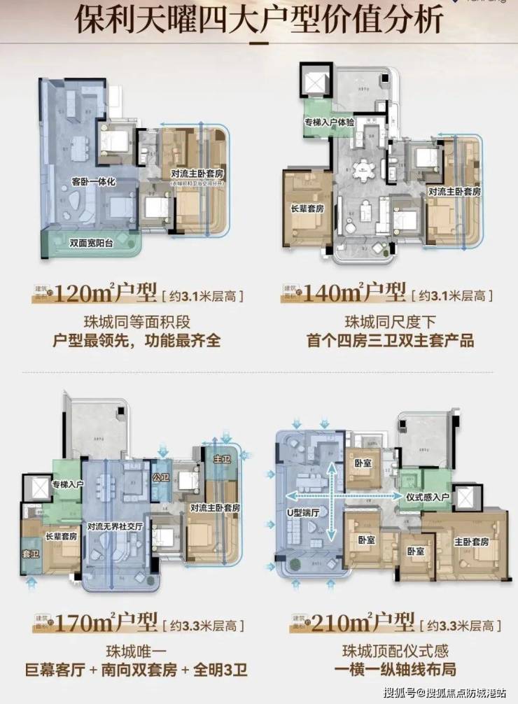 120-220㎡四房:正南北通透,客厅连接约12㎡南向江景露台,主卧套间配备70°环幕飘窗与独立衣帽间,220㎡户型增设“非遗主题”私宴厅。