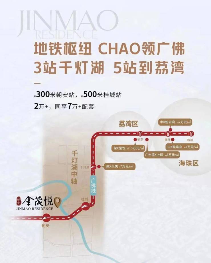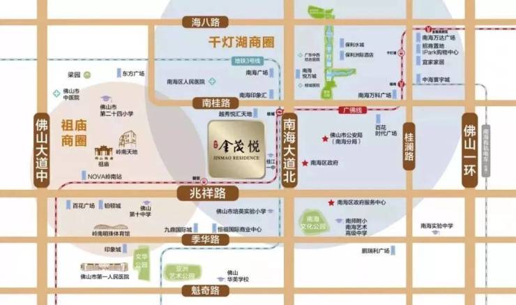 项目坐落于禅城与南海桂城交汇的核心区域,占据广佛线与佛山3号线双地铁口的黄金位置。南侧紧邻连通禅城南海的兆祥路,北侧为南桂路,东侧临水道而建,形成独特的滨水区位优势。步行300米可达朝安站,400米可达桂城站,2站直达祖庙,3站到达千灯湖,5站即至荔湾,构建起30分钟广佛核心生活圈。周边规划2地铁4横3纵立体交通网络,海八路、佛平路直通荔湾,三龙湾大道连接番禺,季华路贯穿城市主轴,佛山大道、南海大道、佛山一环构成快速通勤体系。项目占位千灯湖南板块,毗邻佛山第一CBD千灯湖、桂城文化政治中心及祖庙三大核心商圈,3公里范围内汇聚千亿级商业配套与城市繁华,是真正的广佛同城核心居住区。朝安金茂悦提供购房咨询联系方式(已认证)400-622-0051