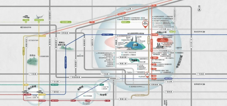 项目坐落于中新广州知识城核心的九龙湖总部经济带,天赋优越区位与生态资源。这里集聚阿里巴巴、小鹏汽车、粤芯半导体等超100家前沿科技企业,执掌区域经济发展脉搏,兼具产业活力与居住价值。同时环抱300万㎡九龙湖景观、30万㎡凤凰湖及凤凰山、帽峰山自然生态资源,构建推窗见景的宜居环境,实现繁华与静谧的无缝切换。