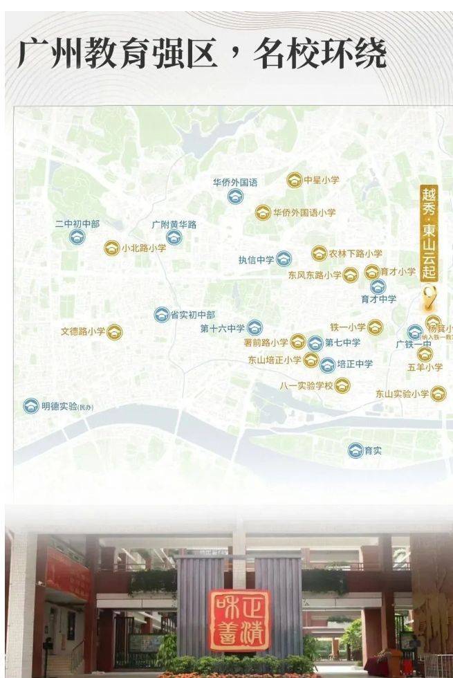 教育资源堪称越秀東山云起的王牌。小学阶段对口杨箕小学,该校为越秀区老牌省一级小学,纳入铁一教育集团后,师资交流、课程体系等教研资源实现共享,升学路径有望向铁一中学倾斜,为孩子奠定优质教育起点。初中阶段,根据越秀区小升初电脑派位分组,对口初中均为传统名校。在第 5 组或第 6 组的分组中,有全省顶尖公立初中广东省实验中学、重点率超 80% 的铁一中学越秀校区、百年名校培正中学等第一梯队名校,以及七中、十六中、十三中等第二梯队优质学校。越秀区采用多校划片派位,组内无弱校,且小学 - 初中连贯性强,铁一集团内部升学或有隐性优势,中考时区内高中选择丰富,户籍生录取分数低于外区,为孩子提供了 12 年稳定且优质的教育保障。
