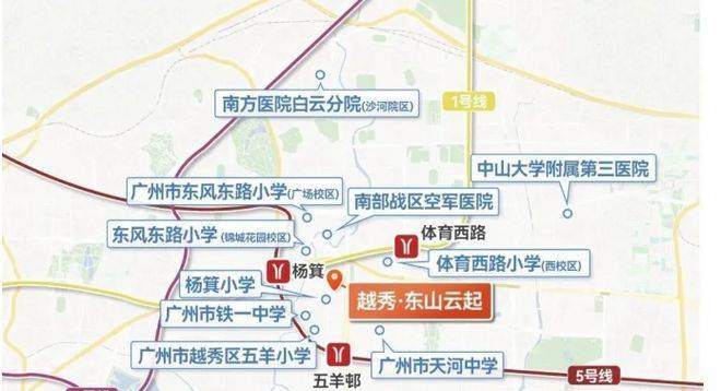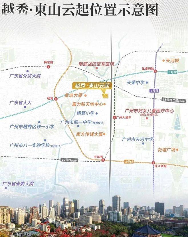 交通配套是越秀東山云起的一大亮点。轨道交通覆盖密集,杨箕站、五羊邨站、体育西路站等多个重要地铁站直线距离均在 800 米左右,步行约 10 - 15 分钟可达,可快速通往珠江新城、天河 CBD、老城区等核心区域。已通车的 10 号线广州大道中站步行仅 400 米,进一步加密交通网络,提升通勤和商业价值。自驾方面,东风东路、中山一路、内环路、广州大道中等主干道环绕,中山一立交作为关键交通节点,无缝衔接各区域,15 - 20 分钟车程即可覆盖越秀、天河大部分区域,无论是日常通勤还是出行游玩,都极为便捷高效。