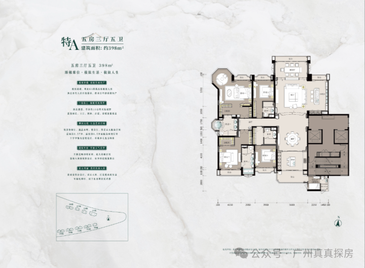 5,大平层设计注重社交与私密性,约17米一线江景大横厅、全屋景观面超32米,总统级主人套房、双宴会厅等功能空间齐全,满足家族居住、宴请与私密需求。