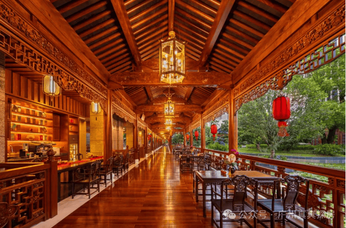 融合晋派大气与徽派精巧,千米风雨连廊串联 21 座亭台廊轩,600 余棵百年名树全冠移植,96 块匾额楹联取材唐诗宋词。