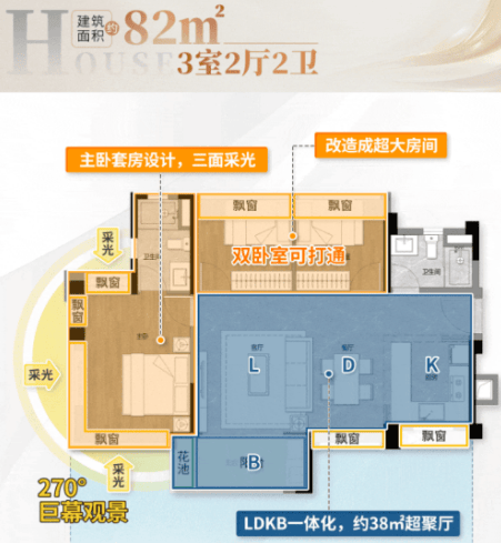 82㎡三房两卫:横厅设计,南北对流,客餐厅同宽约5.7m,270度超大角度采光,享受海园双景。
