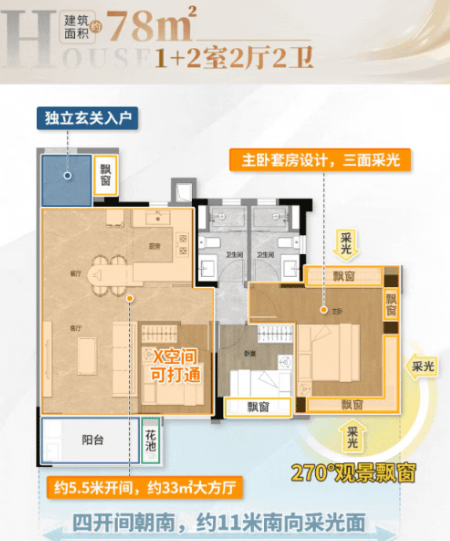 77㎡三房两厅两卫:四开间朝南,超11米南向采光面,豪华主卧设计,动区LDKB一体化布局。