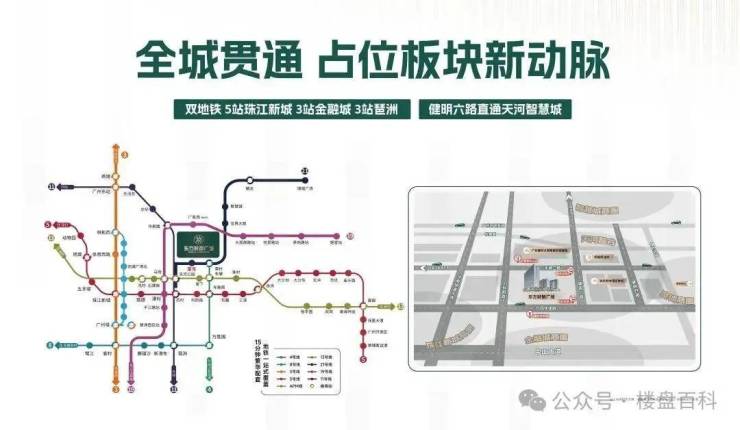 地铁——已开通的广州地铁21号线棠东站,步行可达,较远点的地铁4号线黄村站,以及规划中的19号线广氮东站就在项目门口,目前5站珠江新城、5站琶洲、3站金融城、3站智慧城,实现15分钟通达市区各大核心商圈;