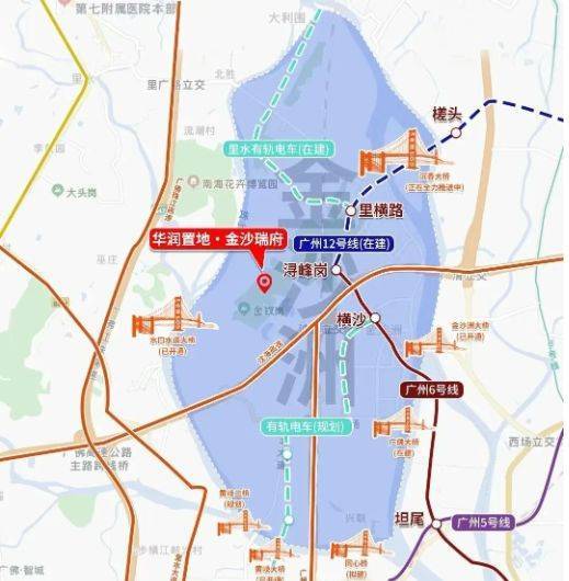 金沙瑞府位于白云区金沙洲板块,可通过轨道交通与城市道路系统实现广佛区域的通勤联通。轨道交通方面,项目与地铁6号线及12号线浔峰岗站存在直线距离连接,可实现与荔湾、越秀、天河等中心城区的轨道换乘通达。道路方面,金沙洲区域拥有大坦沙大桥、水道口大桥、黄岐大桥、金沙洲大桥等多座跨江交通设施,形成内联白云与荔湾、外接佛山中心区域的通勤方式。此外,沉香大桥、同心桥等工程仍在建设中,碧江大桥亦处规划阶段,未来将进一步改善片区道路穿透能力。