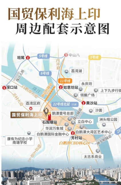 国贸·保利海上印位于荔湾区白鹅潭板块核心腹地,距离在建的地铁11号线石围塘站仅约200米,是名副其实的地铁上盖物业。11号线作为广州首条地铁环线,未来将串联天河、越秀、海珠、荔湾等核心城区,实现快速换乘,通达全城。