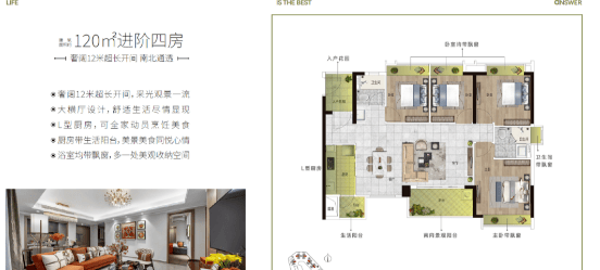 120㎡四房两卫户型:南北向设计,四房布局适合多人口家庭居住。户型布局合理,动静分区明确,公共活动区域和私密居住区域互不干扰;四个卧室空间方正,采光良好,能够满足家庭成员的居住需求;客厅连接超大阳台,采光通风极佳,视野开阔;双卫生间干湿分离,使用更方便。