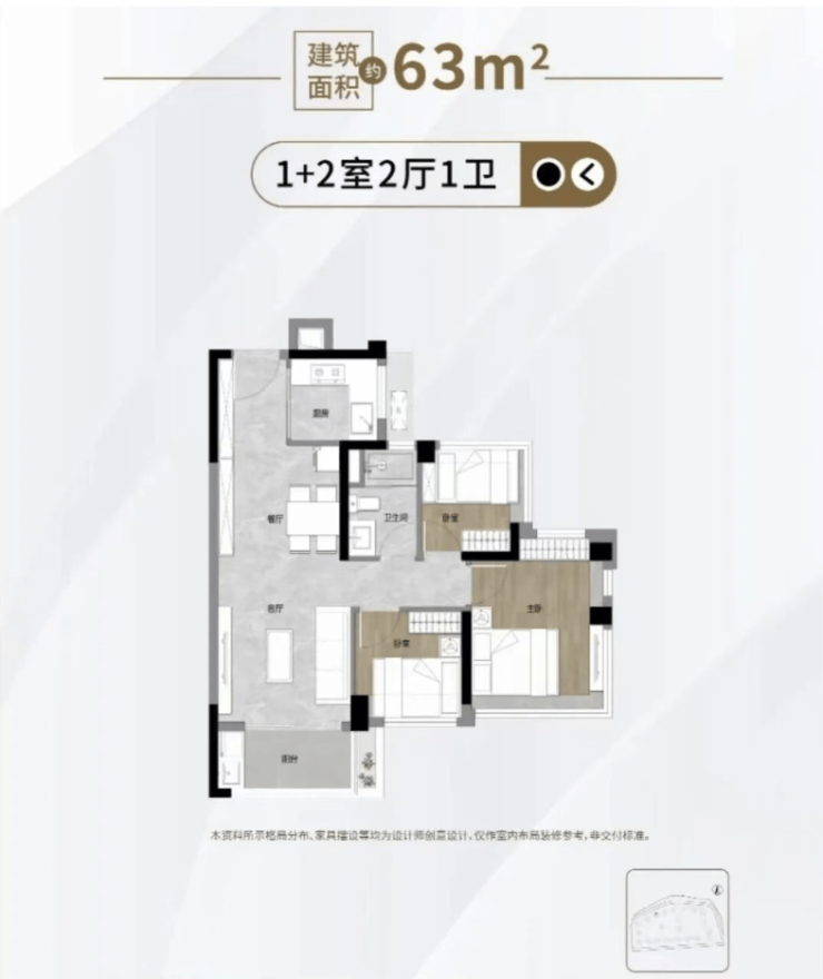 63㎡三房一卫:实测使用率超107%,三开间约9米采光面,总价约110万起(首付15万起),刚需上车首选。