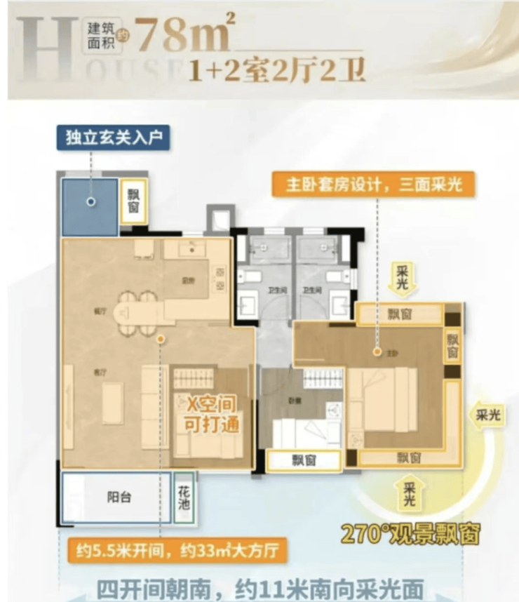 78㎡三房两卫:四开间朝南,超11米南向采光面,主卧270°环幕飘窗,总价约135万起。