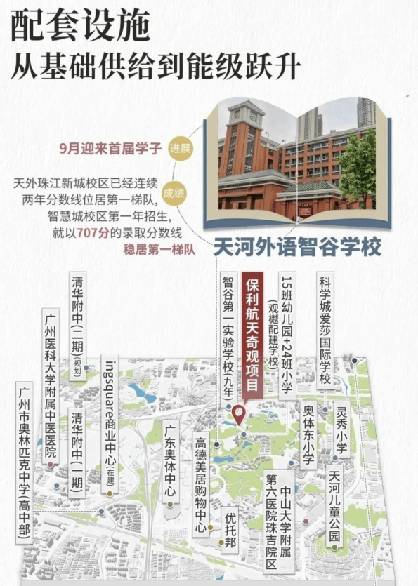 教育,是家庭置业的核心考量。保利辰园·湖境所在的黄村街道,已明确纳入天河外国语学校智谷校区招生范围。该教育集团作为天河区属第一梯队,其号召力不言而喻。项目周边,越秀观樾配建24班小学,缦云广州配建九年一贯制学校(18班小学+27班中学),后者已于2025年9月正式开学。多重优质教育资源环伺,形成“幼小初”全龄段教育闭环,真正实现“家门口的好学校”。