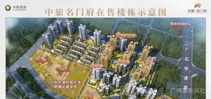 项目名称为中旅名门府,由中旅(广州)实业发展有限公司开发建设,项目地址位于广州市花都区广花路夏花六路与雅芩街交叉口西南 200 米。总占地面积 240000 平方米,总建筑面积 680000 平方米,总户数 4021 户,绿化率 35%,交楼标准为精装修,楼栋规划共 25 栋住宅与 12 栋叠墅,目前主推二地块 “云玺组团” 7 栋高层住宅(ABCDEFG 栋),在售 2D、2G、6D、6B 栋,梯户比 2 梯 6 户,车位数 1:1.2,物管费 2.8 元 /㎡/ 月,交楼时间为 2024 年 12 月及 2025 年 8 月。