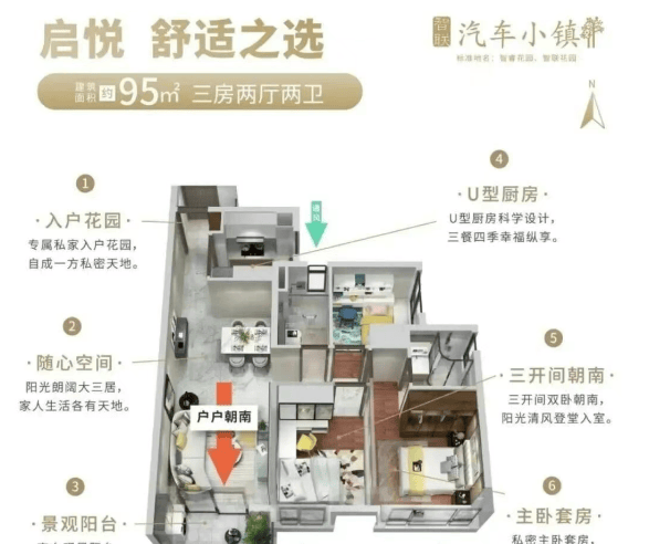 建面约95㎡三房两卫:三开间朝南,主卧带独立卫生间,双阳台设计(生活+景观),功能分区合理,适合三口之家或三代同堂。