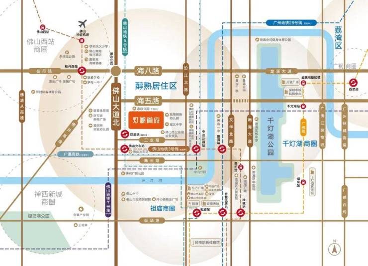 灯湖首府位于佛山城市北拓核心地带,紧邻千灯湖CBD和祖庙双中心,坐拥金融、商业与产业集群。随着广湛高铁佛山站枢纽落地,区域发展潜力巨大。周边商业配套完善,10分钟可达保利水城、万达广场、岭南天地等核心商圈。灯湖首府作为城北门户新地标,承载佛山产城融合示范功能,未来区域价值稳步攀升。
