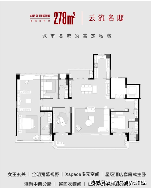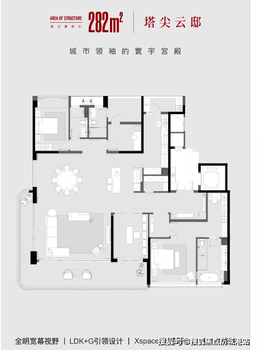 278㎡入门级顶豪:独梯独户设计,南北对流,南向采光面达18米,主卧套间约60㎡(含独立卫浴、步入式衣帽间、书房),LDK一体化横厅约80㎡,可容纳20人社交。