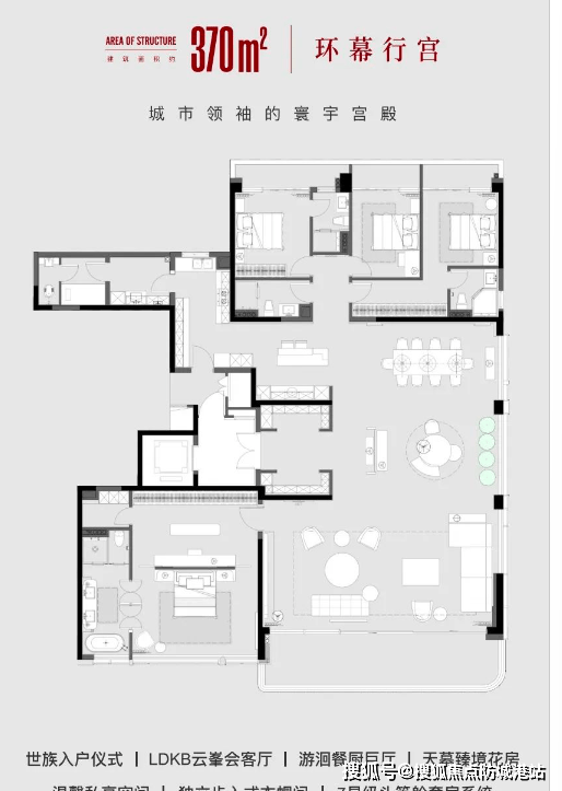 370㎡旗舰级顶豪:双主卧套间设计,中西双厨分离,约120㎡社交横厅+独立宴会厅,适配高端商务接待;层高3.3米(普通住宅2.8-3米),空间尺度感更强。