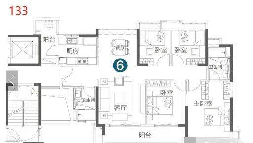 135㎡四房:典型的横厅户型,面积不浪费一分一毫,客厅墙面宽约5米,可以打造霸气十足的电视墙。