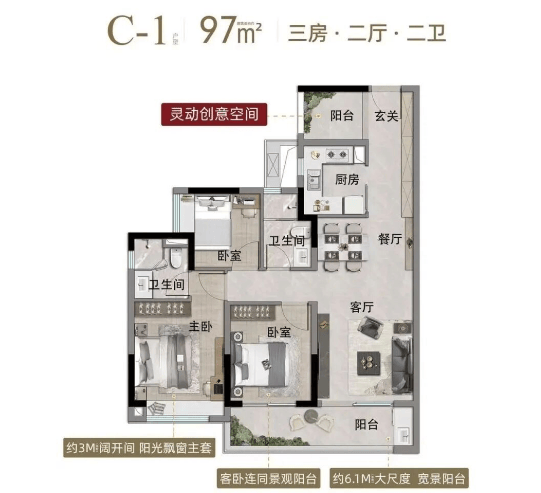 五、户型设计:高得房率 + 宽景阳台,覆盖全改善需求