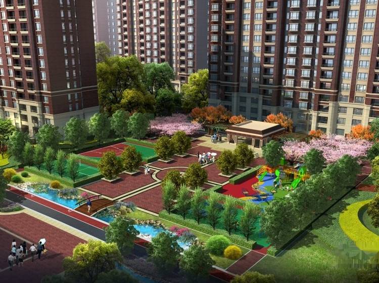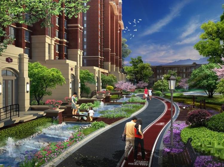 泽信·吉府旨在打造 “互动式景观园林”,园区以美国褐石街区景观为主要风格,同时加入中式山水元素,内部建设有一横一纵两大主景观轴,楼宇间通过规划不同特色景观组团、种植大量四季植物、点缀褐石雕塑小品,使整个园区真正成为一个艺术公园、生态园林。