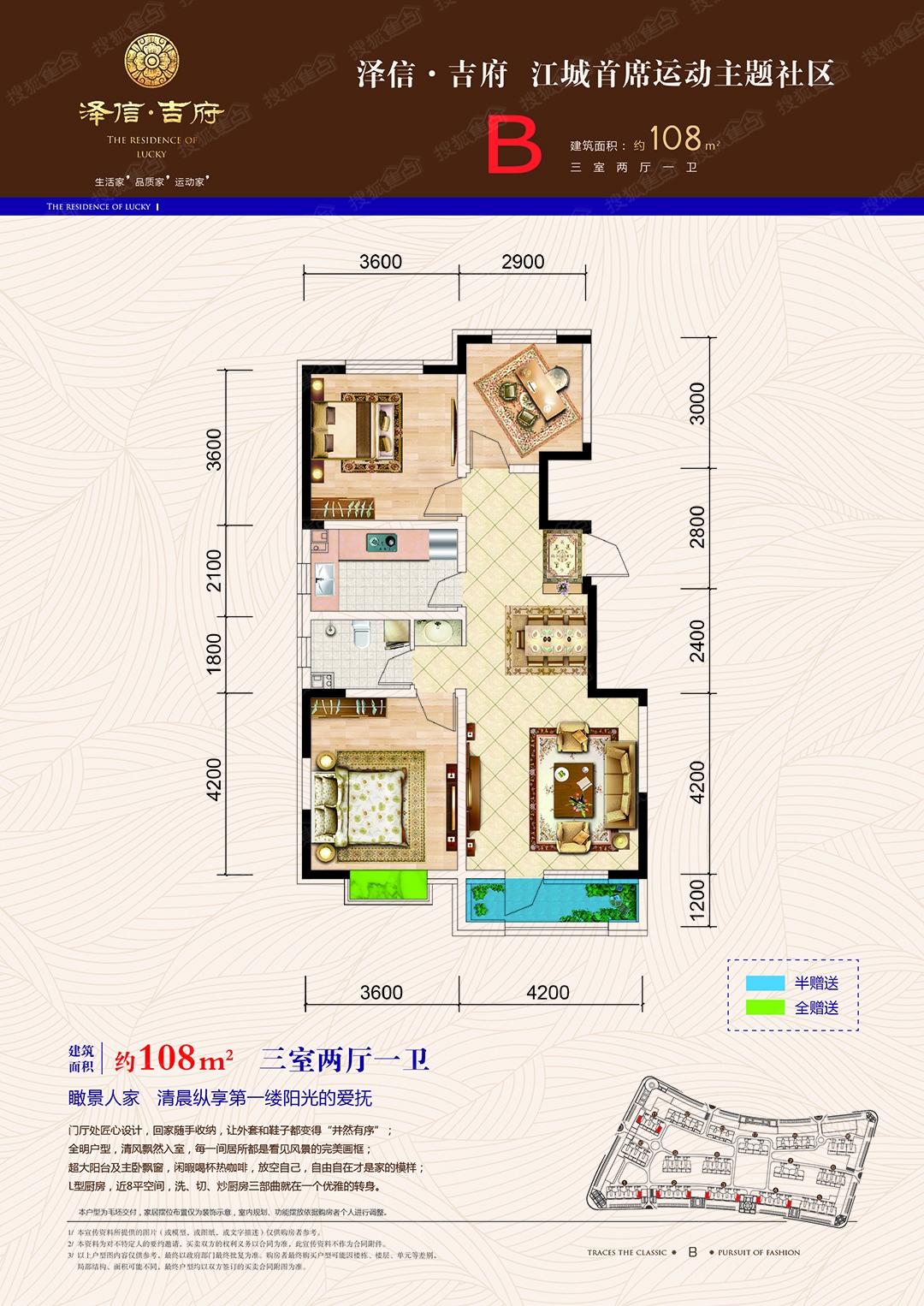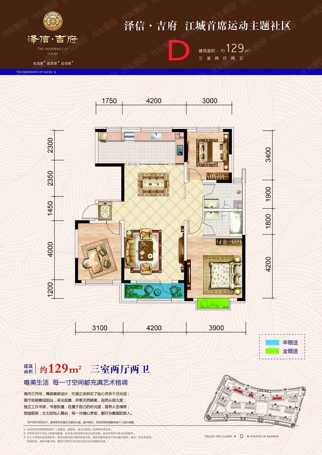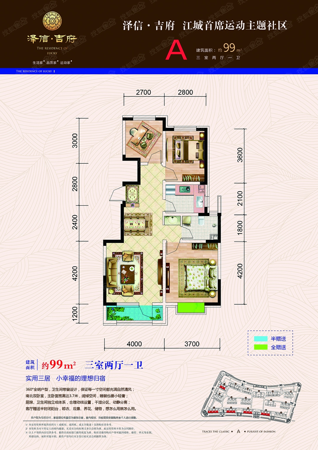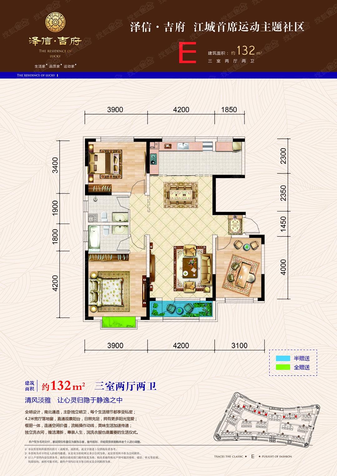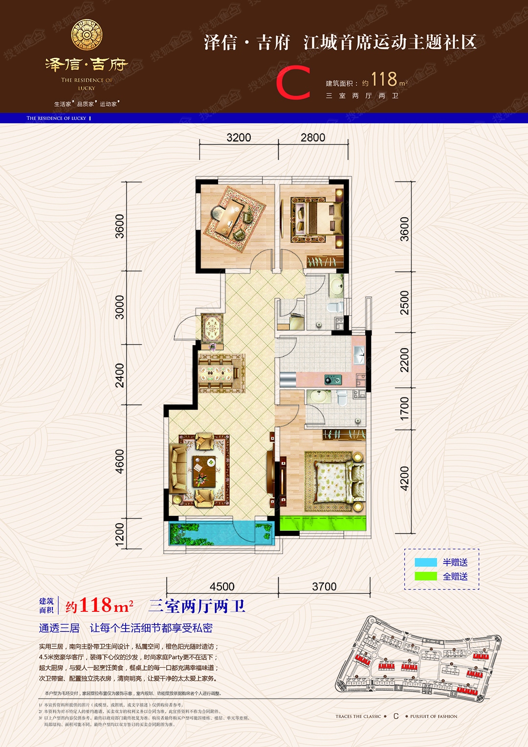 泽信·吉府住宅产品均为一梯两户,面积区间为99-140平米,分别为99平、108平、118平、125平、130平、140平,全部实现三居功能。所有产品格局方正,南北通透,干湿分离,根据不同户型,均选择了不同程度的面积赠送,如主卧飘窗、半封闭阳台等,花同样的钱,住更大的房子,这是希望地产企业在产品上给予业主真正的实惠。