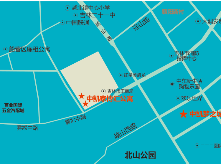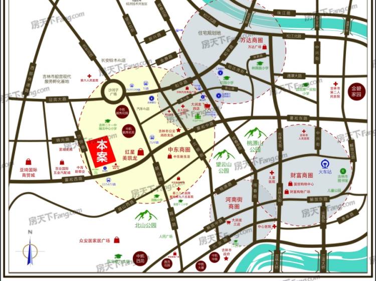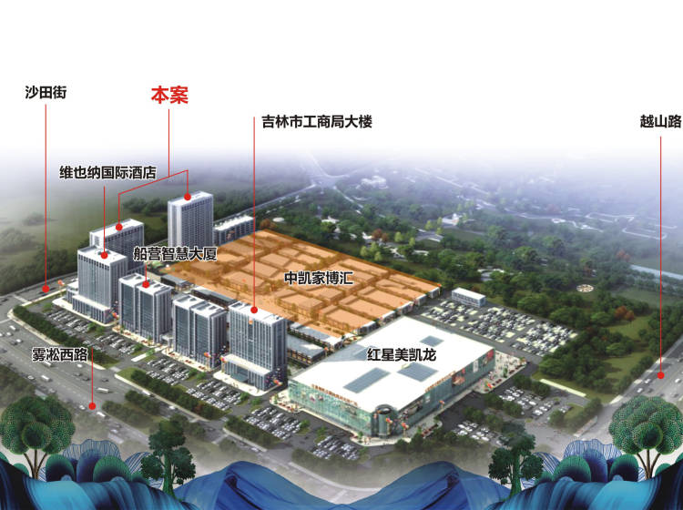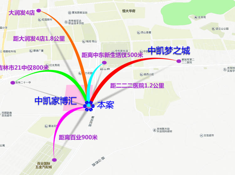 距离项目5公里范围内还有大润发旗舰店、十一中日杂批发、恒大影城、二二二医院等等,各大银行也是汇集于此。众多各式各样的商业配套形成了本项目繁华的商业圈,且本片区有着多个大型成熟小区,它们的社区商业也满足了我们日常生活中购物、餐饮、娱乐、商务等生活所需。项目内吉林市工商局、维也纳国际酒店、吉林银行、船营智慧大厦均已入住。