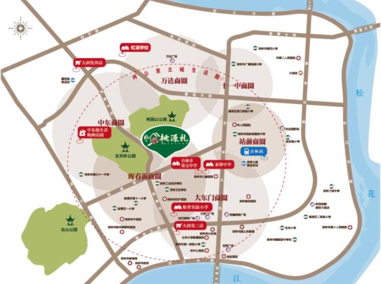 南接桃源路,西接珲春中街,路网发达交通便利。到达火车站、雾凇客运站车行10分钟距离 。步行2分钟内周边公交车54路、69路公交车,可通达全城。而且项目周边珲春街商圈、中东商圈、大东门商圈、站前商圈、万达商圈、十一中商圈六大商圈环绕。项目在珲春街商圈及中东新生活商圈辐射范围内。我们两公里生活圈内覆盖了包括大润发三店、大润发四店、中东新生活、万达广场等大型商业,车程都在5到7分钟。项目周边医疗、教育、金融等基础生活配套也非常成熟,这附近有农业银行,吉林银行,中国银行。医院有吉林市中心医院、吉林市儿童医院、口腔医院、北华大学附属医院等这些三甲级医院等。周边学校吉林市第五中学、亚桥中学、吉林实验小学、船营实验小学、吉林第一实验小学等优质教育资源,为以后孩子上学提供了便利的条件。距离项目对面步行5分钟距离还有恒大影城,可以满足您日常的休闲娱乐所需。项目周边玄天岭公园、桃园山公园、北山公园三山环绕,占据城市稀缺山体资源,是吉林市的上风口地带,地势高,环境好,特别适宜人居住生活。