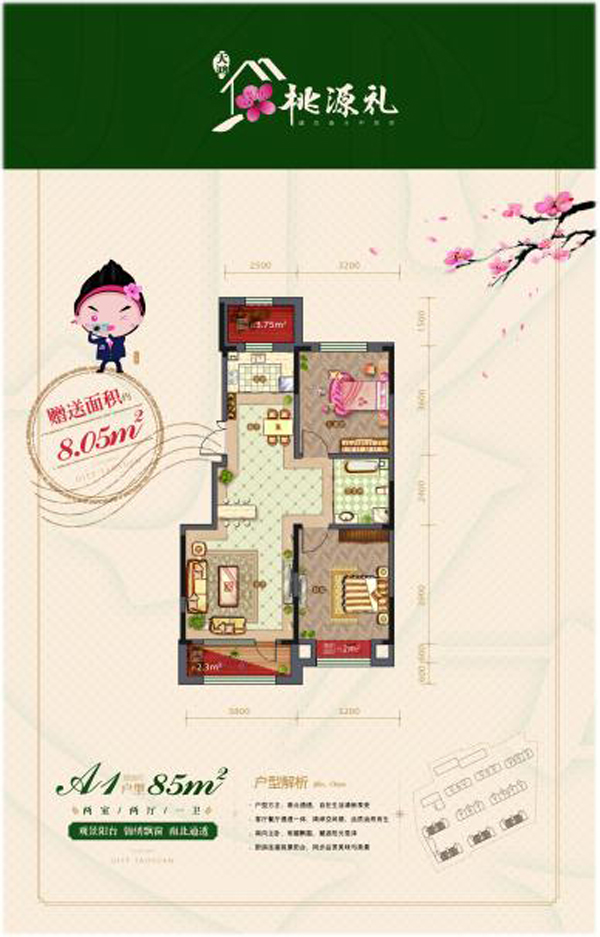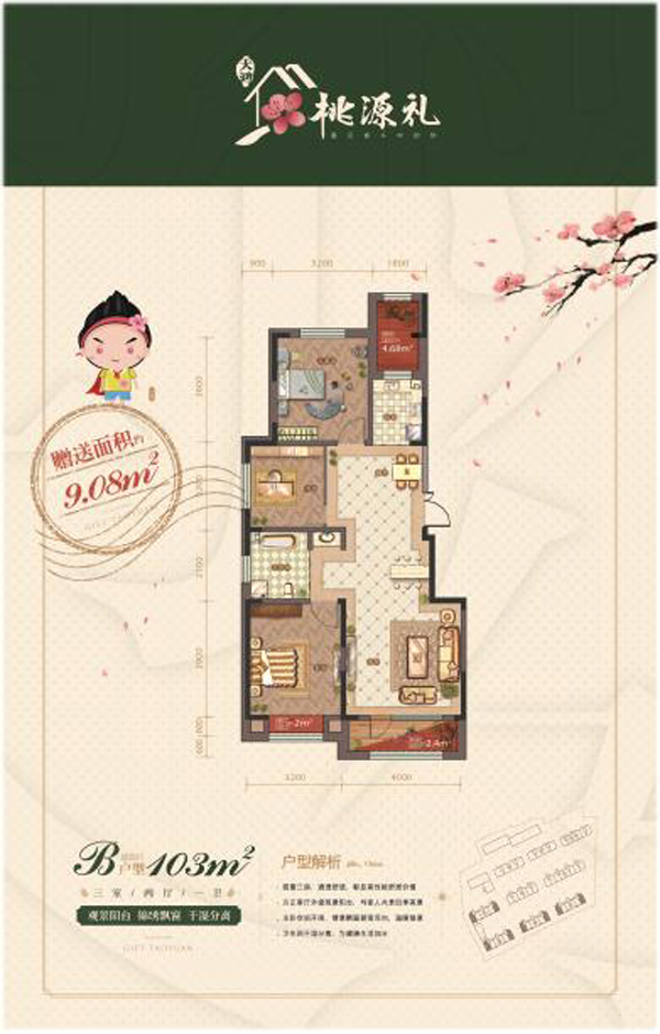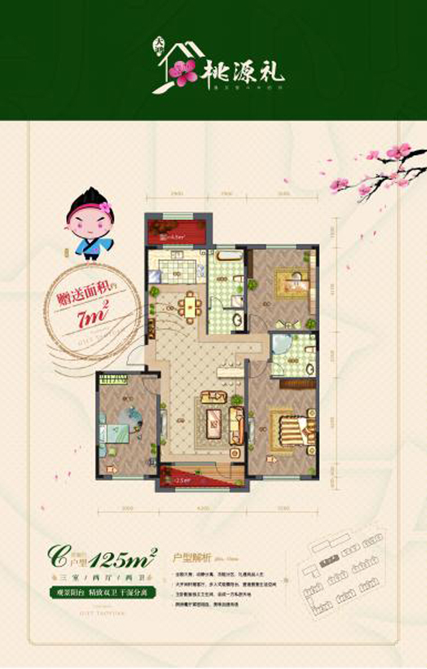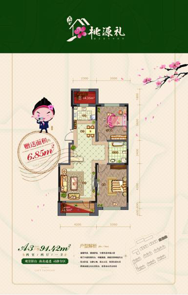 总占地面积约3.5万平方米,总建筑面积约9万平方米,绿化率31%。园区规划为6栋高层和3栋多层产品,每栋产品均采用了一梯两户的产品布局。项目定位为“吉林首席全家庭型情景社区“,是为奋斗中的吉林人打造的生活情景型文化社区,注重从老人到孩子的各个家庭成员的生活需求。园区种植近百株桃树,春季时节随地可见最美桃林。项目打造了两轴三园的规划概念,一条为项目入口处的生态景观轴和康养观赏园,为中老年业主休闲、健身、养生提供场所。一条为运动乐园主题景观轴,主要打造了童趣亲子乐园和青年运动场。在小区入口处,项目采用了水幕墙的缔造方式,强调“师法自然”的山水意境。在青年运动场区域,我们规划了羽毛球场及篮球场,为中青年的休息时光提供挥洒青春的场地。在童趣亲子乐园处,项目针对不同年龄段的孩子有不同的游乐体验项目。像沙坑、创意滑梯、风情秋千、攀岩区、生态种植园等,给孩子和父母一个收藏欢笑的情景场。