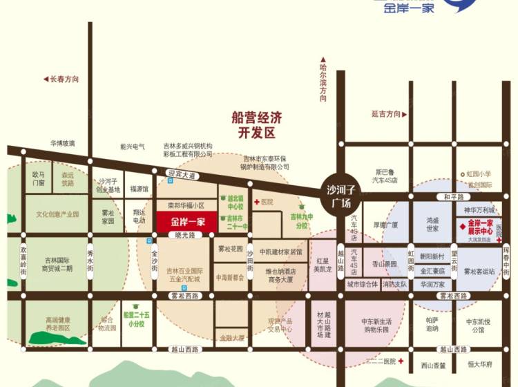 金岸一家位于船营区金沙街与晓光路交汇处,船营经济开发区内,隶属于吉林市政府重点打造的“西山板块”南居工程范围内,地理位置优越。项目毗邻百业五金国际汽配城和亚奇国际商贸城两大商圈,距离中东新生活和大福源四店只有5分钟车程。