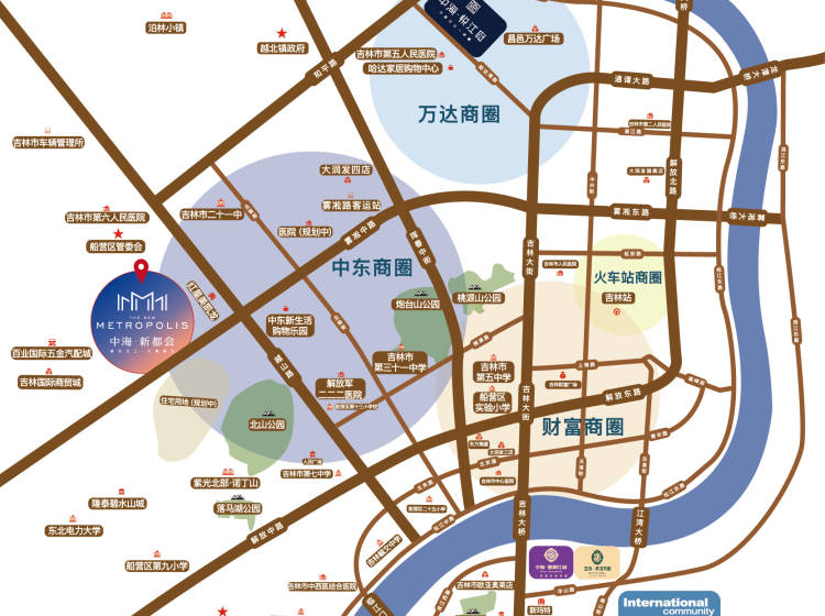 中海新都会整体建筑风格为美式大都会风格,交通路网完善,近享中东新生活购物乐园一站式休闲娱乐配套,同时随着大润发四店进驻、吉林市不动产中心的迁入,使得中东片区成为吉林市新兴的、配套完善的、高速发展区域之一。