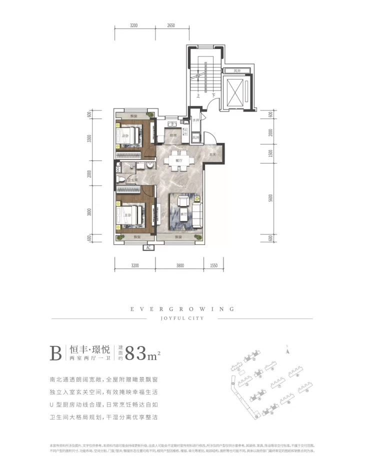【恒丰悦城】户型图:建筑面积约83㎡ 2室2厅1卫 赠送3个飘窗 赠送面积约6平