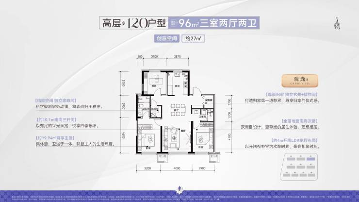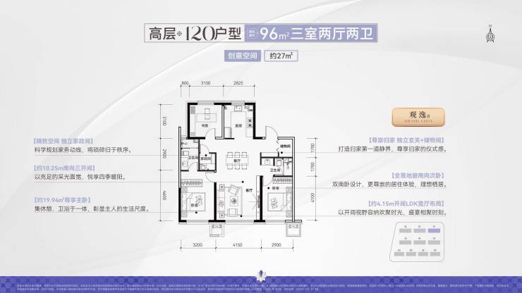 1、最强户型:建面约96-125㎡全三房,百平级最优、区域110之王,125改善王牌