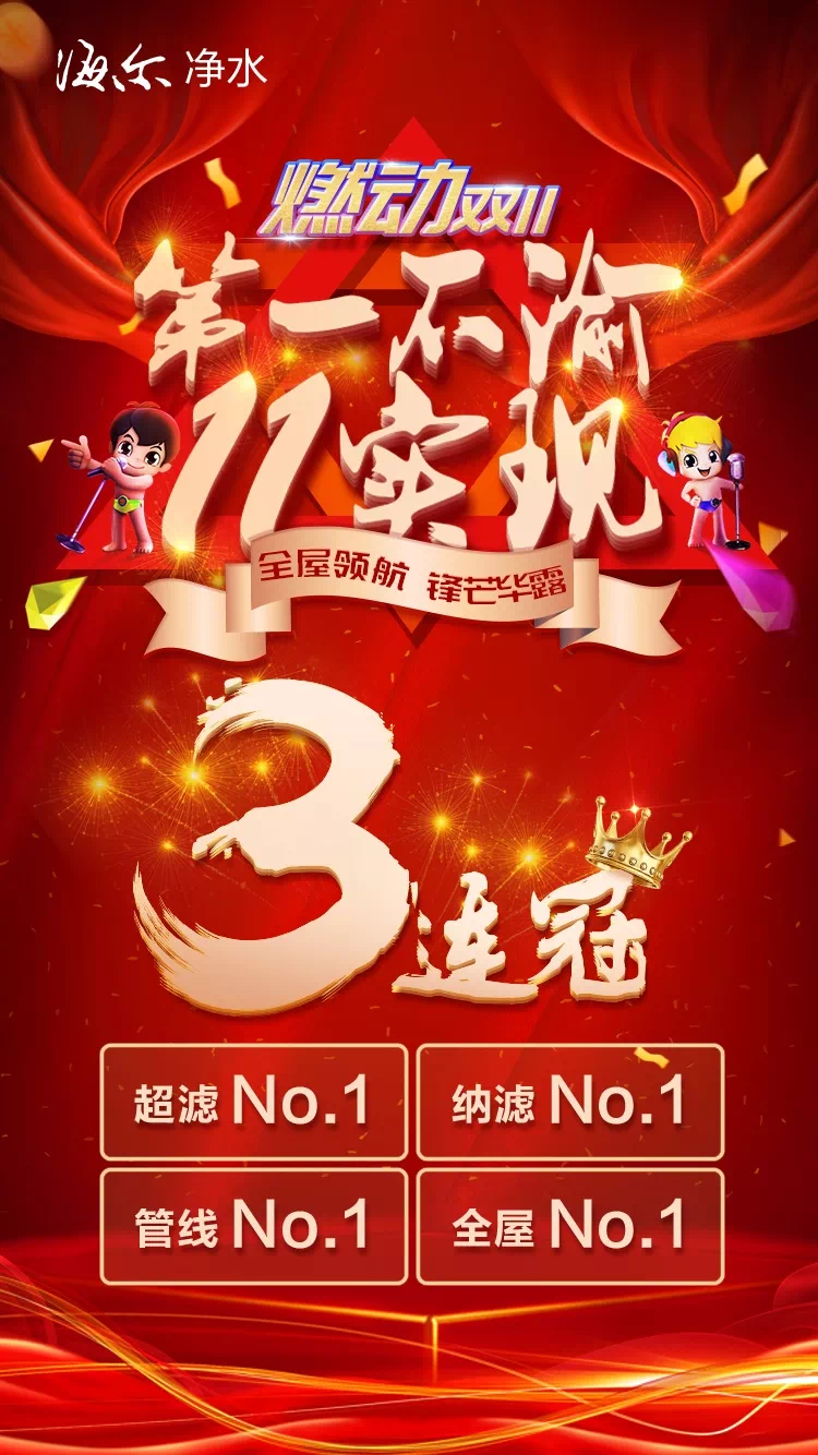 海尔净水实现三连冠,超滤、纳滤、管线、全屋类目全网排名排名前列。