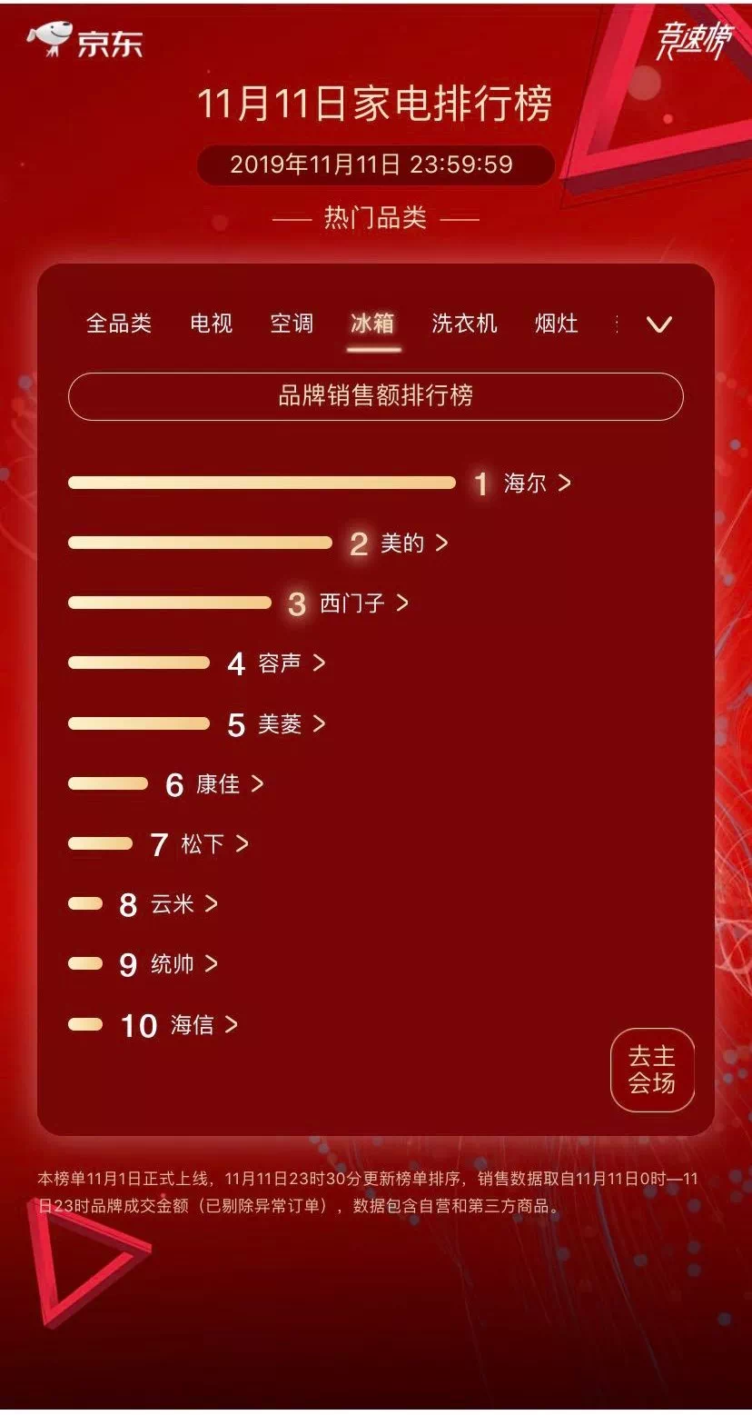 据天猫数据显示,11日当天冰箱品类中海尔3分钟销售破亿,以较快速度成为排名前列破亿冰箱品牌。